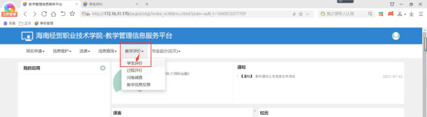3.学生点击菜单栏“教学评价”项目下拉按钮,选择“学生评价”,然后逐一选择课程进行评价,并保存提交。