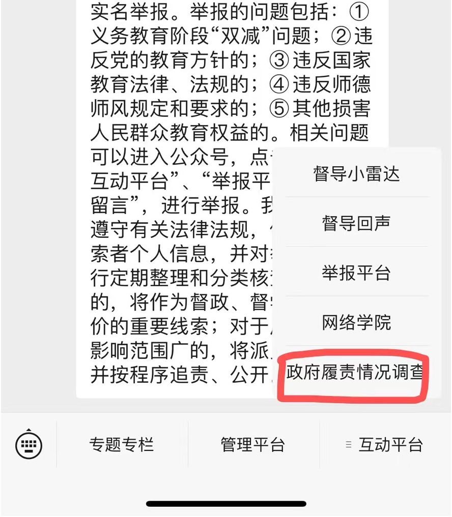 扫描“中国教育督导”微信公众号二维码(如下),选择“关注公众号”。进入该微信公众号界面后,点击首页底部“互动平台”菜单,选择“政府履职”进入问卷填答;填答人根据各自身份(社会人士、教师和学生),选择相应问卷填答。