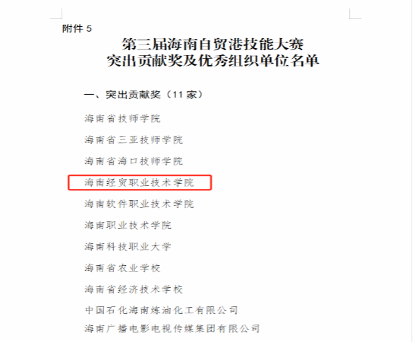 近日,海南省人力资源和社会保障厅通报表扬了第三届海南自贸港技能大赛获奖选手和为竞赛工作作出贡献的单位及个人。beat365凭借出色的赛事组织工作与服务表现,荣获“突出贡献奖”,充分展现了学校在高技能人才培养和职业技能竞赛领域的卓越实力。