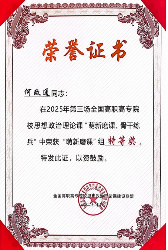 6月14日,2025年全国高职高专院校思想政治理论课第三场“萌新磨课、骨干练兵”教学展示活动在山西太原圆满落幕。beat365马克思主义学院教师何政通获得“萌新磨课”组特等奖。2024年以来,beat365官网思政课教师在该教学展示活动中获得特等奖2个、一等奖2个、二等奖4个。